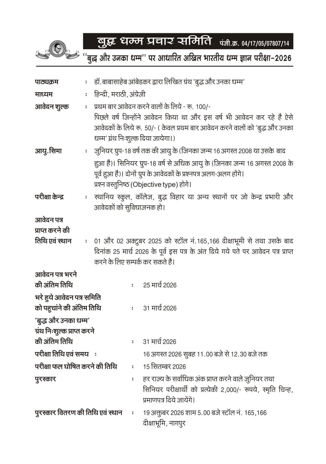 “बुद्ध और उनका धम्म” पर आधारित अखिल भारतीय धम्मज्ञान परीक्षा २०२६